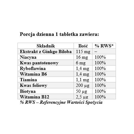 Skład: Substancja wypełniająca (celuloza, fosforan dwuwapniowy), ekstrakt z Ginkgo Biloba 24/6, substancje przeciwzbrylające (kwasy tłuszczowe, dwutlenek krzemu, sole magnezowe kwasów tłuszczowych), amid kwasu nikotynowego, D-pantotenian wapnia, ryboflawina, chlorowodorek pirydoksyny, chlorowodorek tiaminy, kwas pteroilomonoglutaminowy, D-biotyna, cyjanokobalamina.
