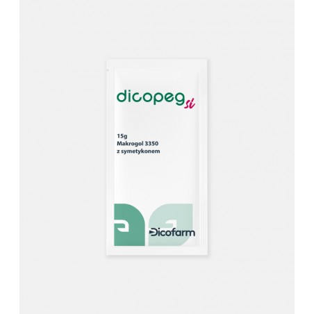 Działania niepożądane: Mogą wystąpić zaburzenia żołądkowo-jelitowe (ból w jamie brzusznej, wzdęcia, uczucie pełności w jamie brzusznej, nudności, nietrzymanie stolca). Biegunka jest wtórnym efektem przyjmowania zbyt wysokich dawek Dicopeg si i można jej uniknąć zmniejszając dawkę. Rzadko zgłaszano przypadki nadwrażliwości (wysypka skórna) po zastosowaniu produktów zawierających makrogol. W razie potrzeby należy przerwać leczenie i skonsultować się z lekarzem.