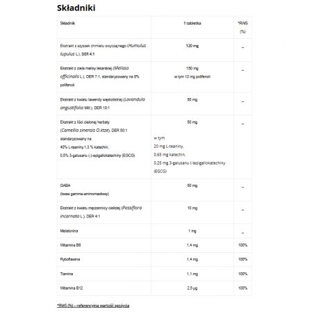 Składniki: substancja wypełniająca - Celuloza mikrokrystaliczna, ekstrakt z melisy (Melissa officinalis), substancja wypełniająca fosforan wapnia, ekstrakt z chmielu (Humulus lupulus L), Kwas gamma aminomasłowy (GABA), Ekstrakt z lawendy (Lavandula angustifolia), Ekstrakt z zielonej herbaty (Camellia sinensis O. Ktze), Substancja wypełniająca Sól sodowa karboksymetyloceluloza usieciowana, skład otoczki (środek glazurujący hydroksypropylometyloceluloza, środek glazurujący - hydroksypropyloceluloza, stabilizator - guma arabska, stabilizator-polidekstroza, stabili zator-trojglicerydy średniołańcuchowe, środek wypełniający - talk), ekstrakt z męczennicy (Passiflora incarnata L) substancja przeciwzbrylająca - sole magnezowe kwasów tłuszczowych, Witamina B6 (chlorowodorek pirydoksyny), Witamina B1 (chlorowodorek tiaminy), Witamina 82 (ryboflawina), Melatonina, Witamina B12 (cyjanokobalamina).