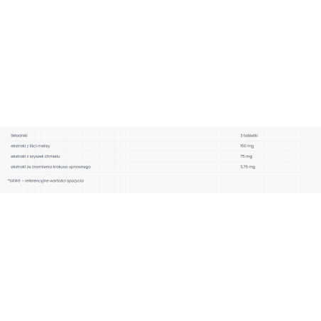 Skład: substancja wypełniająca: celuloza; ekstrakt z liści melisy (Melissa officinalis L.) DER 4:1; ekstrakt z szyszek chmielu (Humulus lupulus L.) DER 4:1; otoczka (substancja glazurująca: hydroksypropylometyloceluloza; substancja wypełniająca: polidekstroza; barwnik: węglan wapnia; substancja glazurująca: glikol polietylenowy; substancja przeciwzbrylająca: talk; barwniki: tlenki i wodorotlenki żelaza, ryboflawiny); substancja przeciwzbrylająca: sole magnezowe kwasów tłuszczowych; ekstrakt ze znamienia krokusa uprawnego (Crocus sativus L.) DER 4:1; substancja przeciwzbrylająca: dwutlenek krzemu.