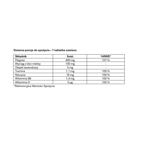 Skład: tlenek magnezu, substancja wypełniająca: węglan wapnia, substancja glazurująca: hydroksypropylometyloceluloza, wyciąg z liści melisy (Melissa officinalis), substancja przeciwzbrylająca: dwutlenek krzemu, substancja przeciwzbrylająca: mono- i diglicerydy kwasów tłuszczowych, substancja wypełniająca: celuloza sproszkowana, tłuszcz palmowy całkowicie uwodorniony, amid kwasu nikotynowego, substancja przeciwzbrylająca: sole magnezowe kwasów tłuszczowych, substancja wypełniająca: izomalt, maltodekstryna, substancja wypełniająca: guma arabska, substancja przeciwzbrylająca: talk, olejek lawendowy (Lavandula angustifolio), cholekalcyferol, chlorowodorek pirydoksyny, trójglicerydy średniołańcuchowe, chlorowodorek tiaminy.