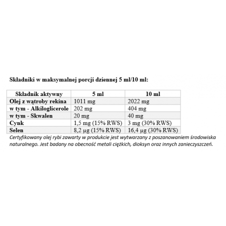 - Zawiera naturalne lipidy, takie jak alkiloglicerole i skwalen, które wspierają organizm (olej z wątroby rekina).