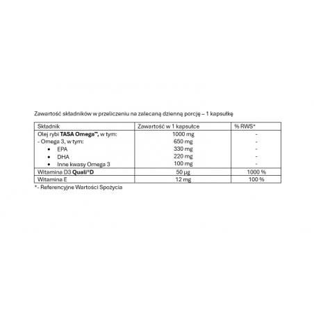 Składniki: olej rybi TASA OmegaTM(33% EPA, 22% DHA), żelatyna, substancja utrzymująca wilgoć – glicerol, witamina E (octan DL-alfa tokoferylu), witamina D3 – Quali®-D®(chlorekalcyferol).