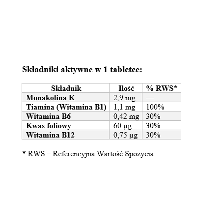 Skład: Substancje wypełniające (celuloza, sorbitole, izomalt), substancje przeciwzbrylające (kwasy tłuszczowe, sole magnezowe kwasów tłuszczowych, dwutlenek krzemu), fermentowany czerwony ryż standaryzowany na 5% monakoliny K, chlorowodorek tiaminy, chlorowodorek pirydoksyny, kwas pteroilomonoglutaminowy, cyjanokobalamina.
