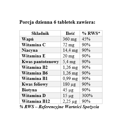 - Zmniejszenie zmęczenia i znużenia: witamina C, niacyna, witamina B6 i B12.