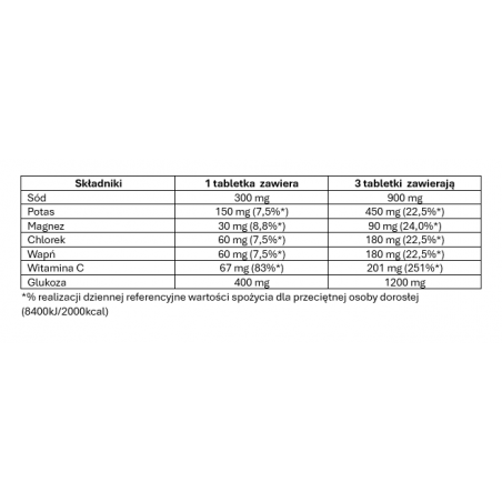Składniki: Diwęglan sodu, regulator kwasowości - kwas cytrynowy, mieczan wapnia, glukoza, subst. wiążąca-sorbitole, sole magnezowe kwasu cytrynowego, sole potasowe kwasu ortofosforowego, chlorek potasu, kwas L-askor- binowy (wit. Cl, regulator kwasowości - kwas jabłkowy, naturalny aromat pomarańczowy, subst. wiążąca - glikol polietylenowy, koncentrat buraka czerwonego, subst. słodząca-sukraloza, barwnik-ryboflawiny