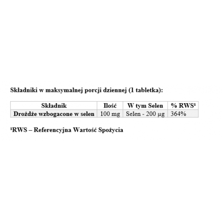 Skład: Substancja wypełniająca (celuloza), drożdże wzbogacone w selen, substancje przeciwzbrylające (kwasy tłuszczowe, sole magnezowe kwasów tłuszczowych, dwutlenek krzemu).